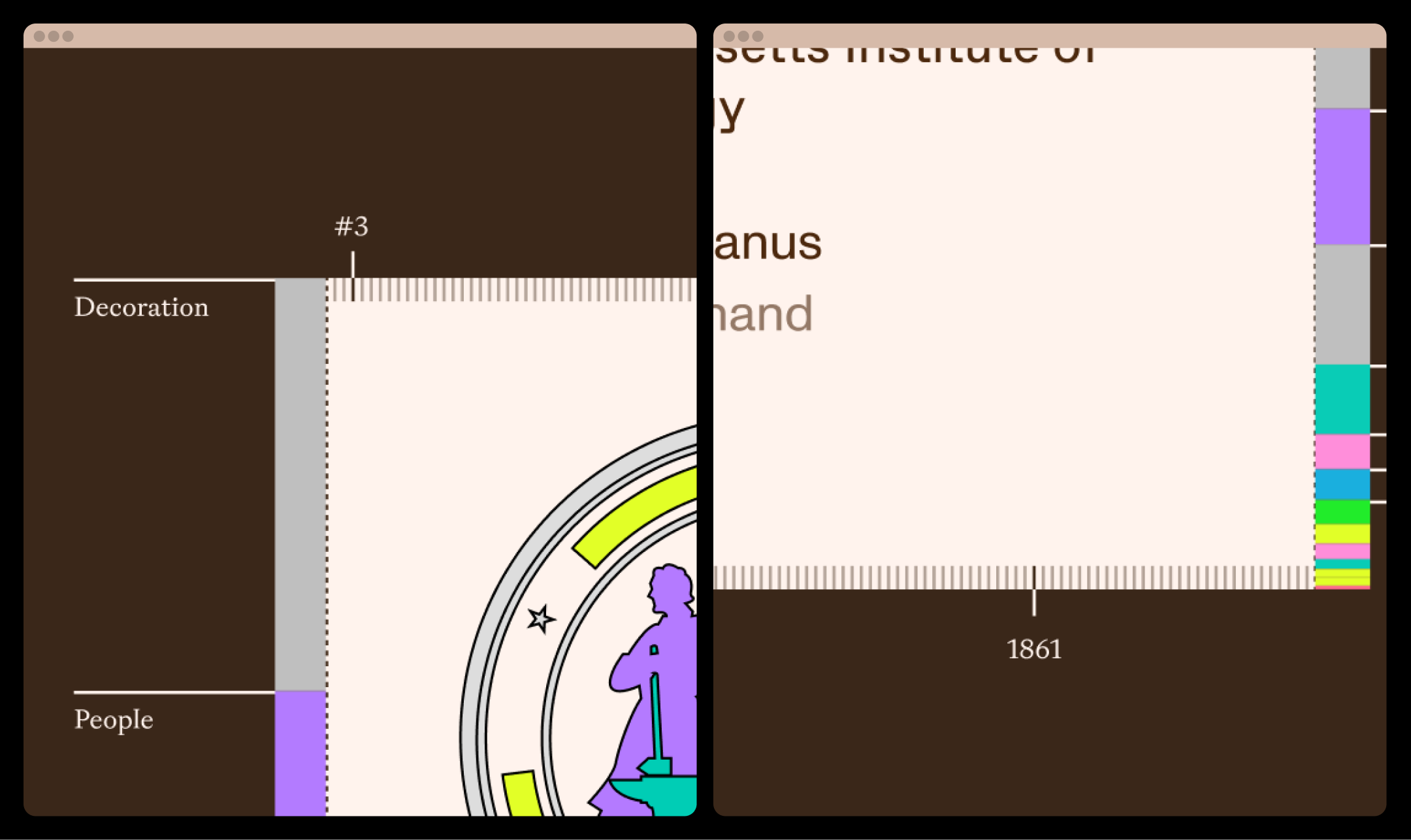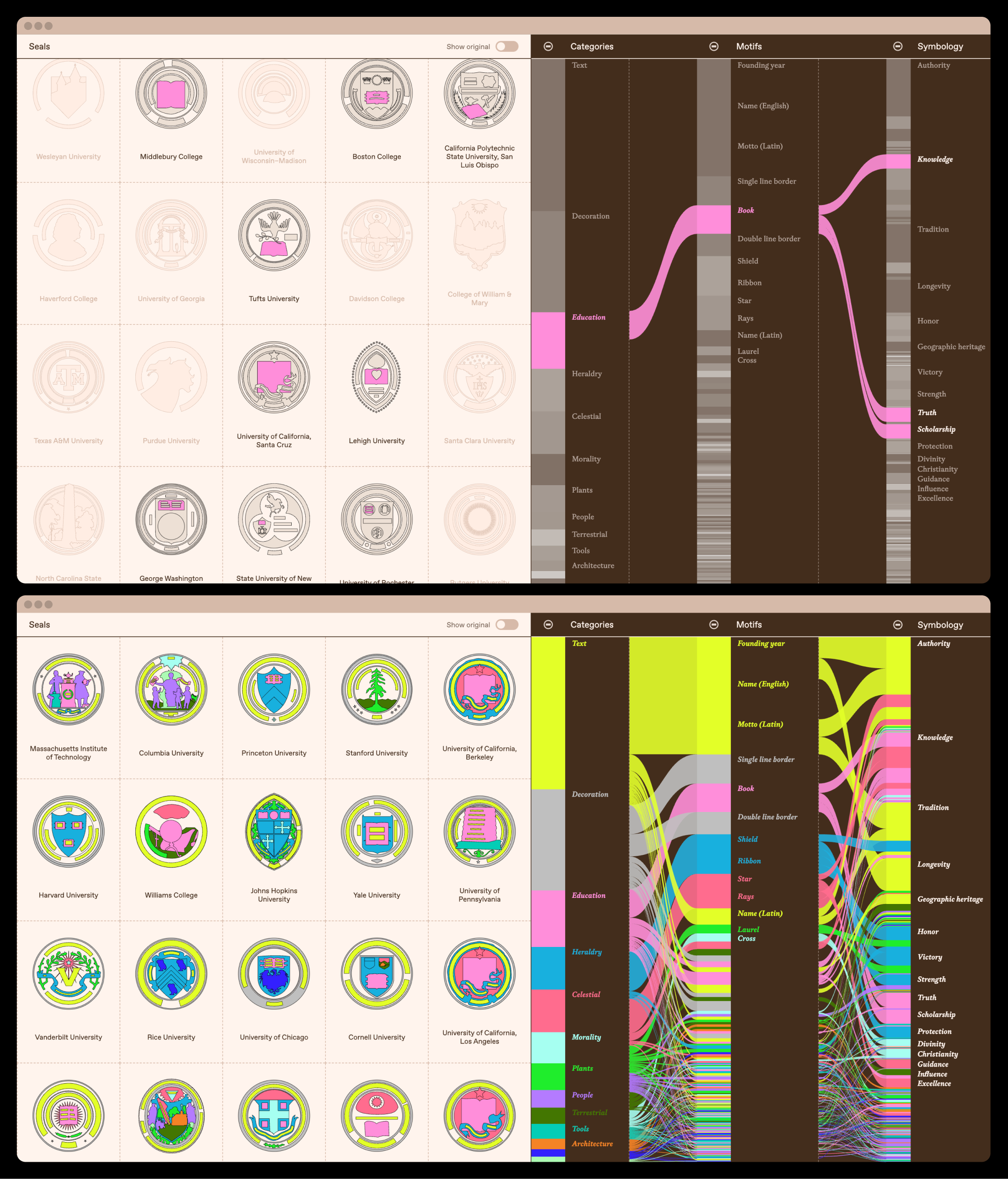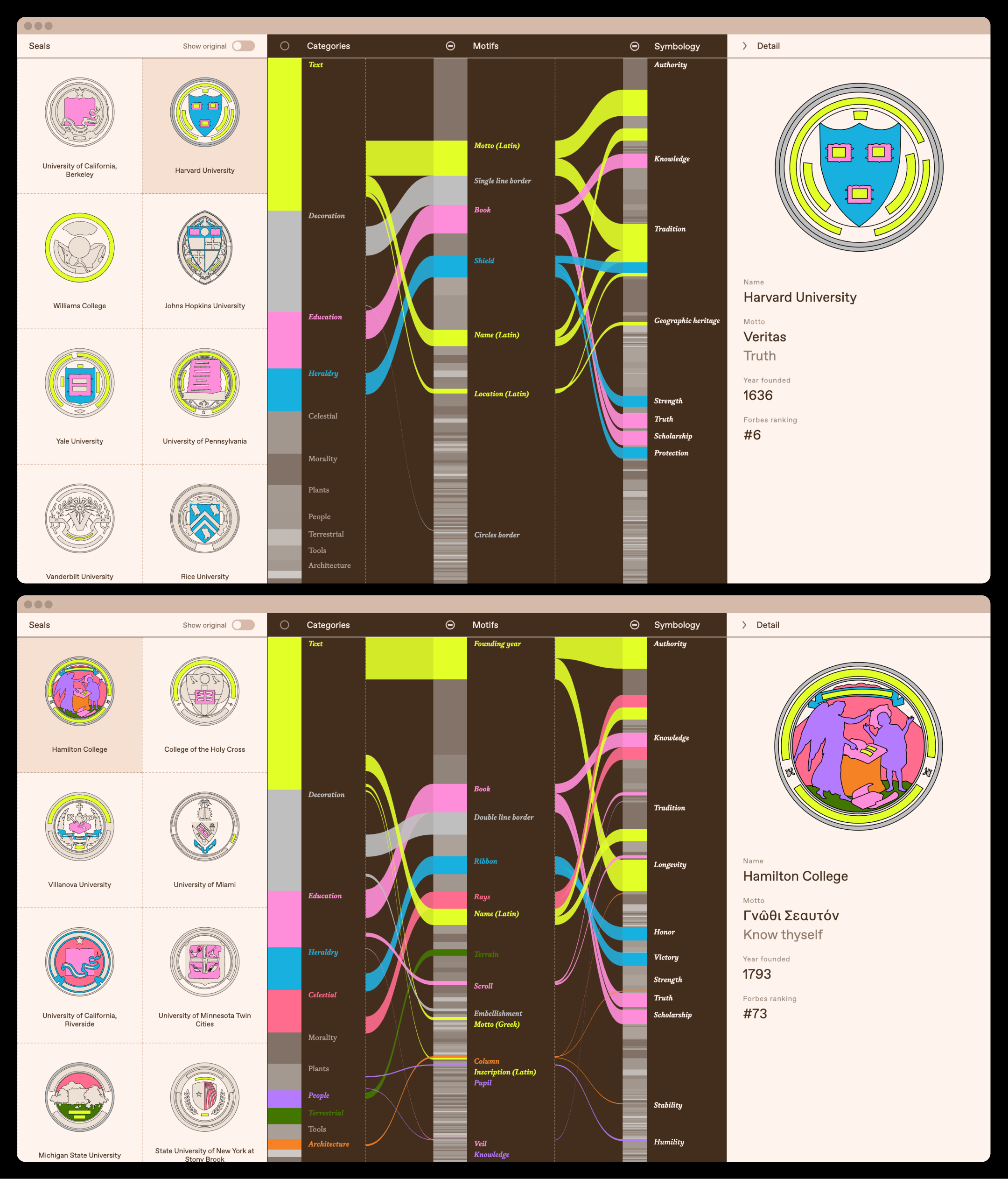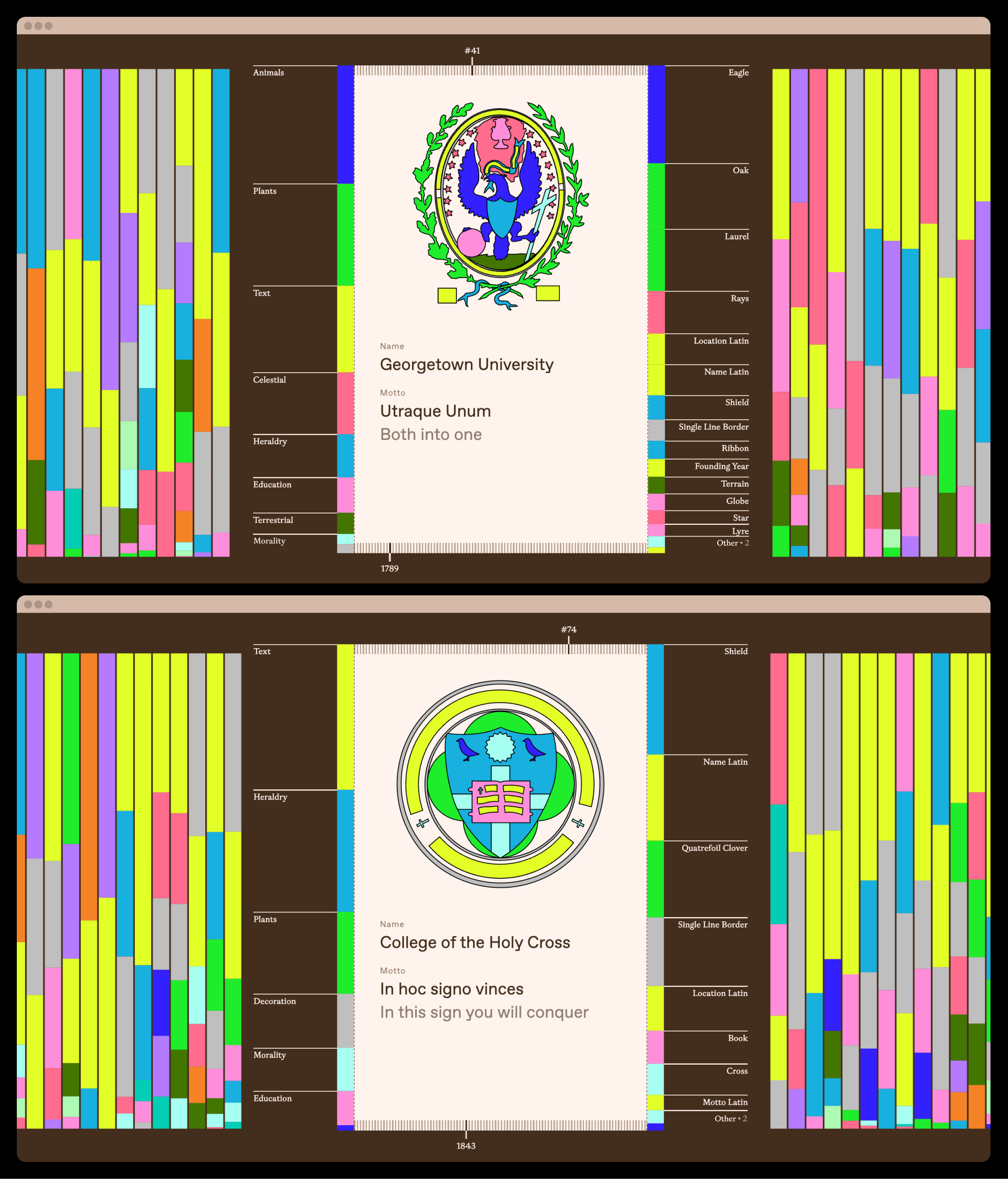 This interactive web experience interprets the American public’s perception of education through the values projected by those seals. It uses data from manually deconstructing the seals of the first 100 entries on Forbes’ List of America’s Top Colleges to visualize the country’s educational mythology.