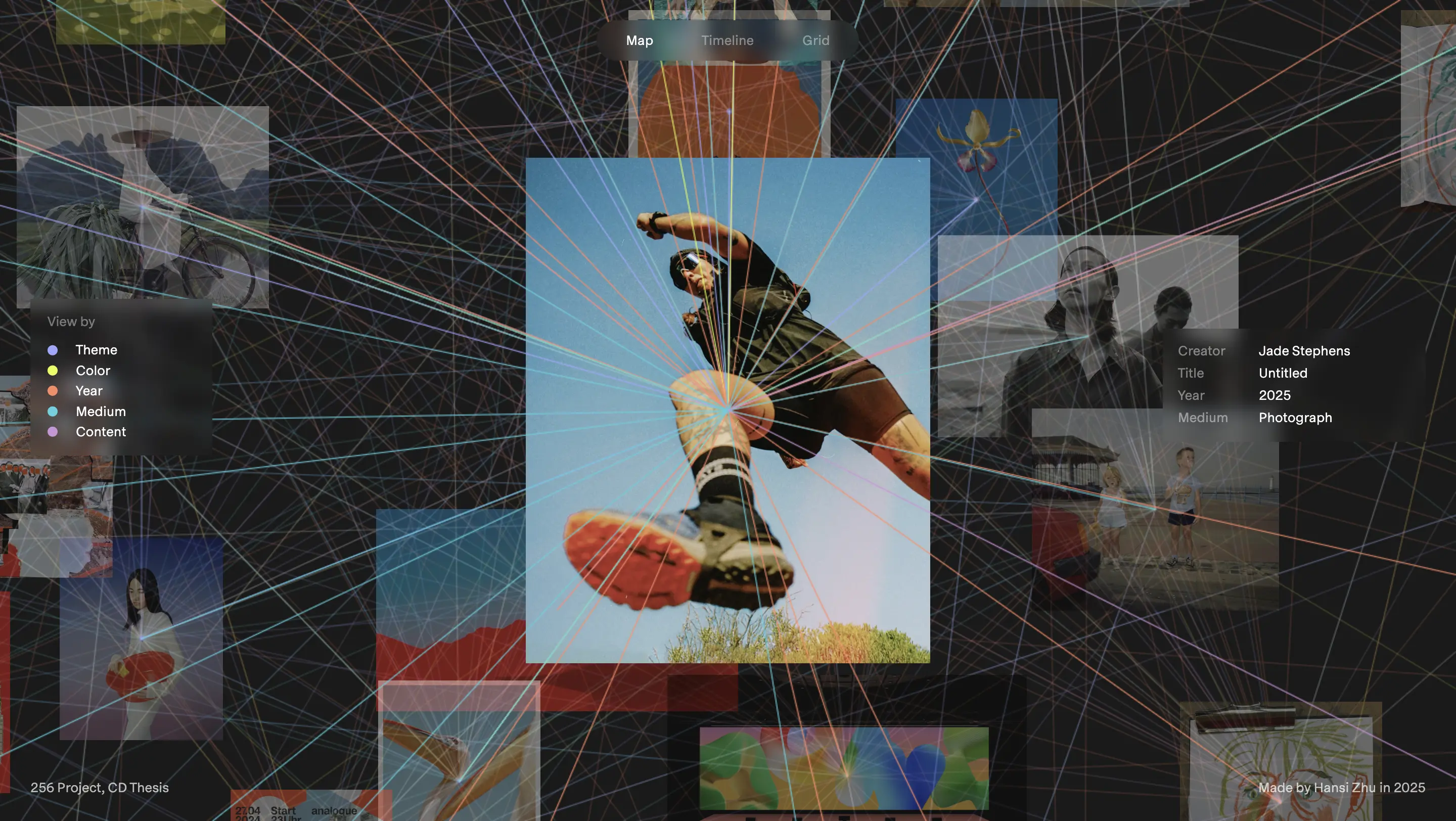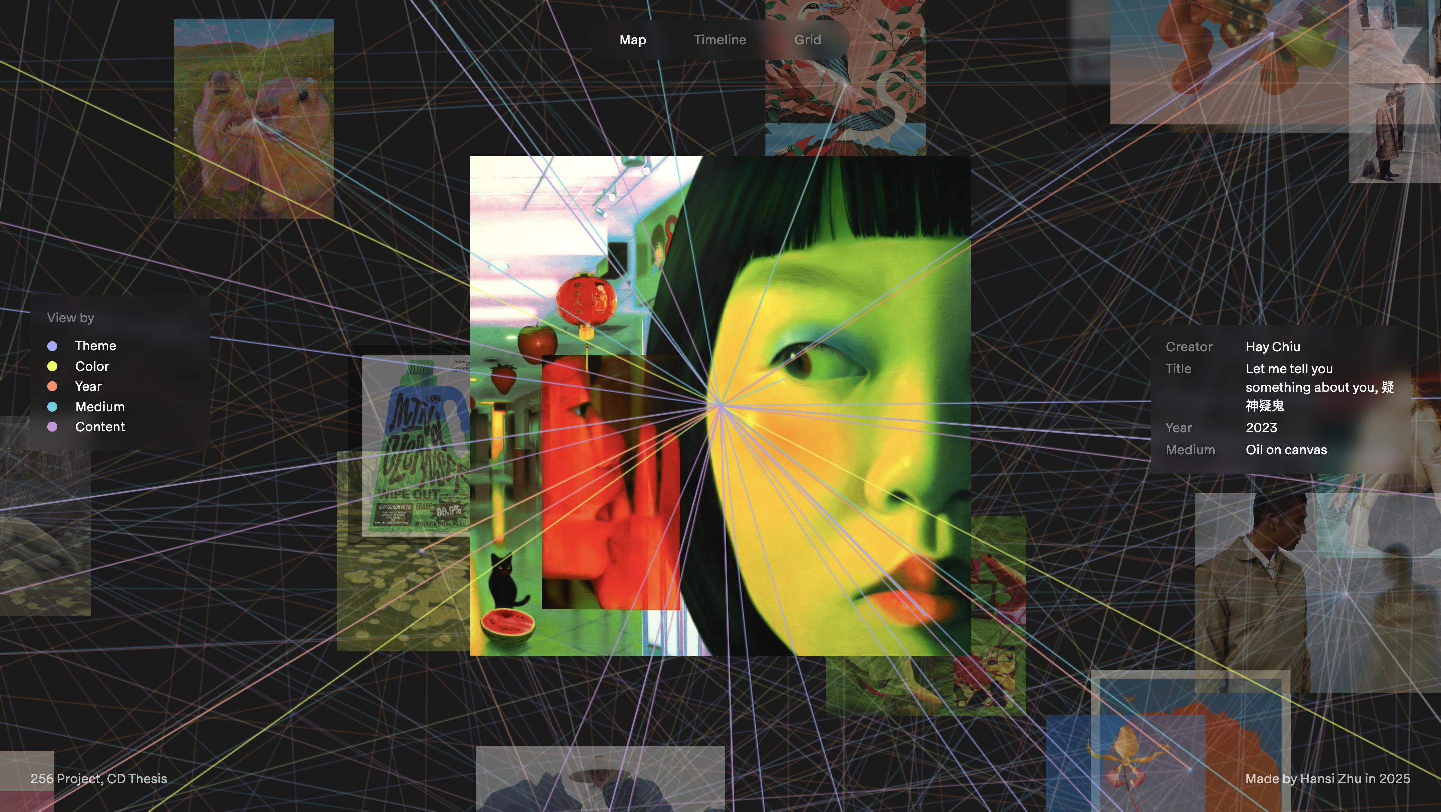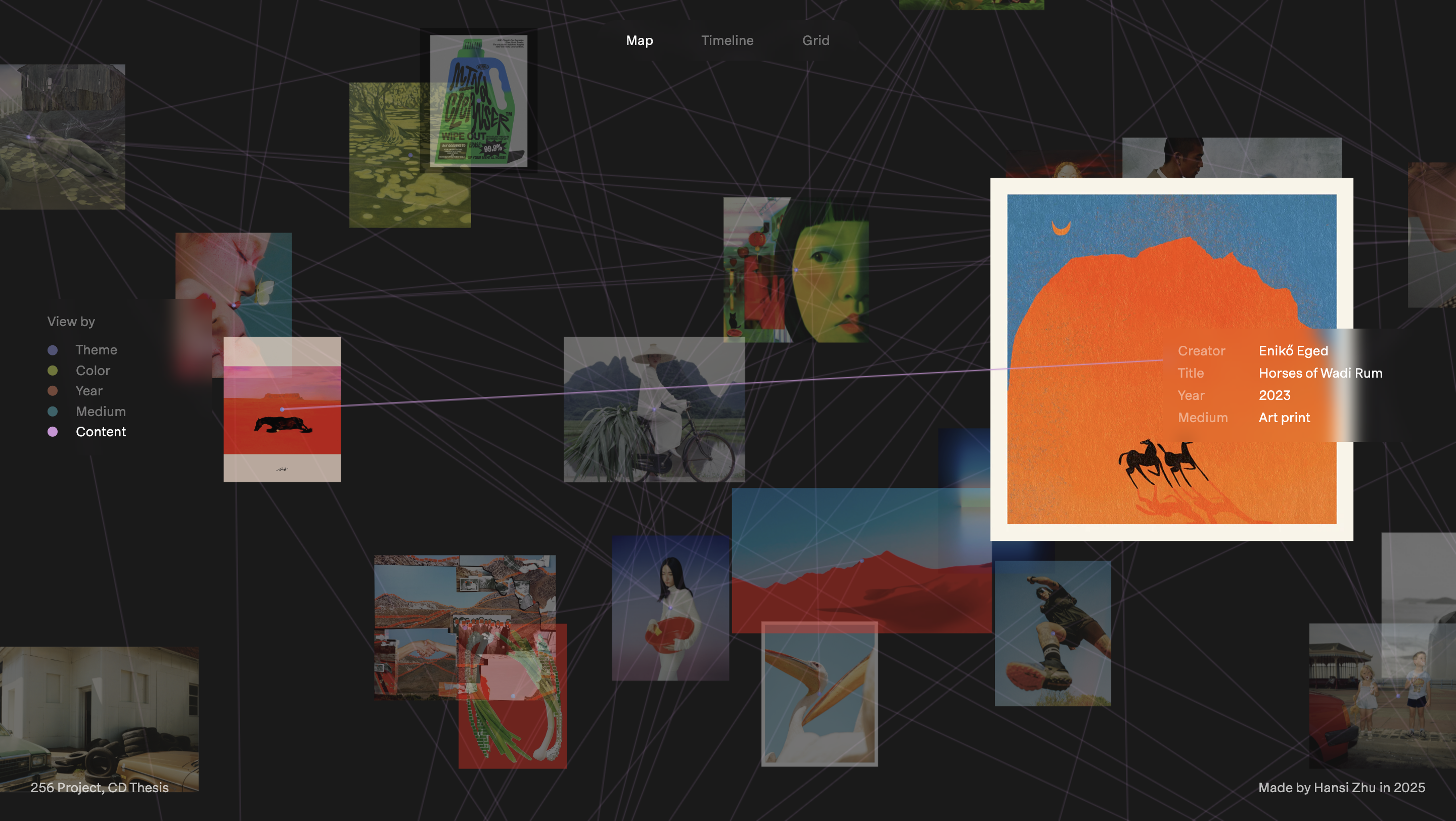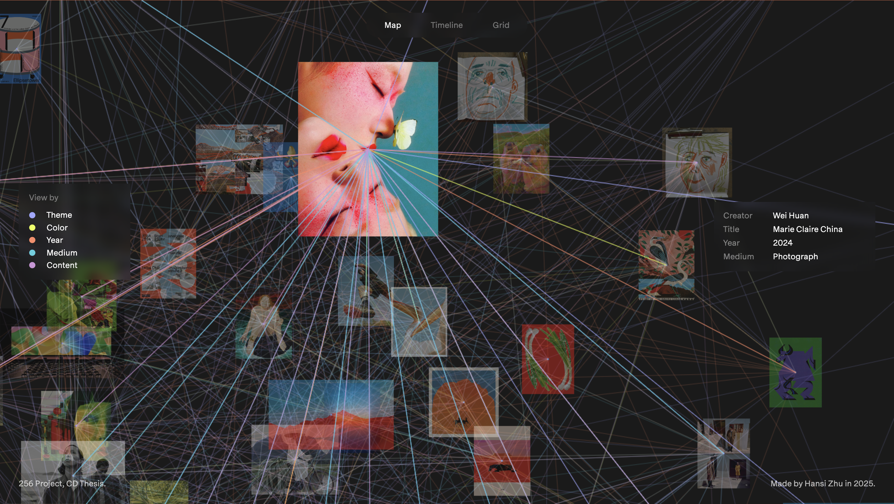 View connecting threads by theme, color, year, medium, and content. Toggle between Map, Timeline, and Grid modes.